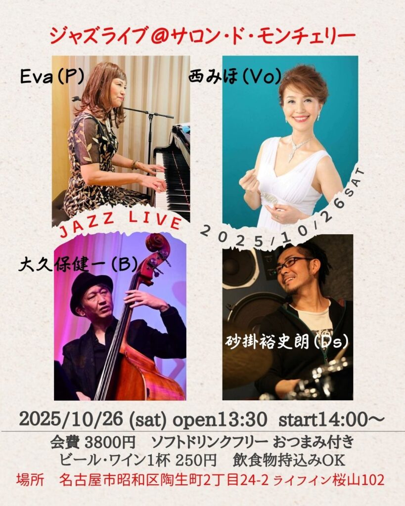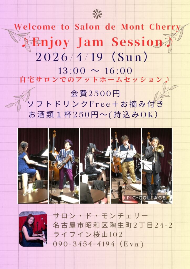 ジャムセッション@桜山サロン 参加費 2500円(ソフトドリンクフリー付)見学の方 500円(ソフトドリンクフリー付)セッションホスト エバ(p)