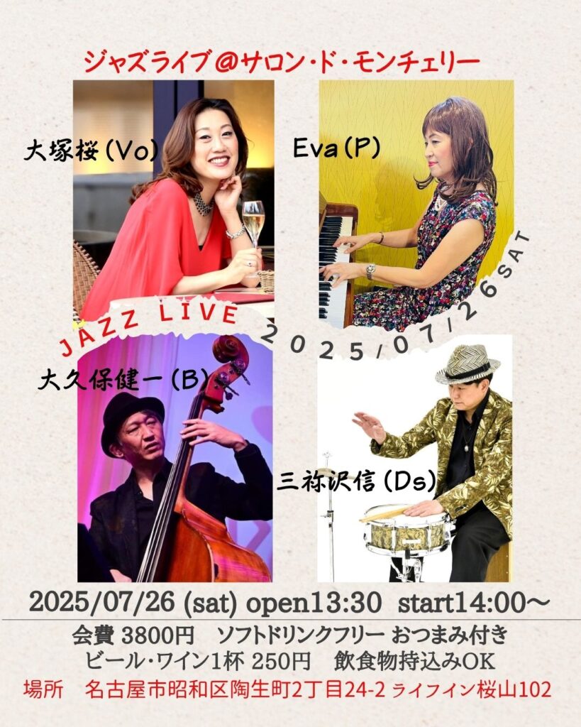 ジャムセッション@桜山サロン 参加費 2500円(ソフトドリンクフリー付)見学の方 500円(ソフトドリンクフリー付)セッションホスト エバ(p)